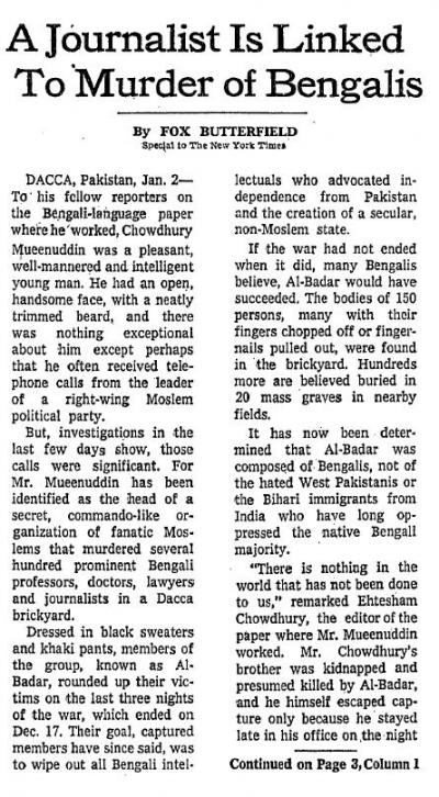 ১৯৭২ সালের ৩ জানুয়ারি নিউইয়র্ক টাইমসে ফক্স বাটারফিল্ডের লেখা ‘আ জার্নালিস্ট ইজ লিংকড টু দ্য মার্ডার অব বেঙ্গলিজ’ নামে একটি বিশেষ রিপোর্ট ছাপা হয়। এতে বুদ্ধিজীবি হত্যাকান্ডে মঈনউদ্দিনের সংশ্লিষ্ঠতার আদ্যোপান্ত বর্ণনা ছিলো। সেখানে পূর্বদেশ সম্পাদক এহতেশাম চৌধুরীর বয়ানে মঈনউদ্দিনের বিরুদ্ধে তার ভাইকে হত্যার অভিযোগ আনা হয়। এহতেশাম নিজে রক্ষা পান অফিসে আশ্রয় নিয়ে। ফক্সের প্রতিবেদনে লেখা হয় : To his fellow reporters on the Bengali-language paper where he worked, Chowdhury Mueenuddin was a pleasant, well-mannered and intelligent young man…there was nothing exceptional about him except perhaps that he often received telephone calls from the leader of a right-wing Moslem political party. But, investigations in the last few days show that those calls were significant. For Mr. Mueenuddin has been identified as the head of a secret, commando like organization of fantatic Moslems that murdered several hundred prominent Bengali professors, doctors, lawyer and journalists in a Dhaka brick yard. Dressed in black sweaters and khaki pants, members of the group, known as Al-Badar, rounded up their victims on the last three nights of the war…Their goal, captured members have since said, was to wipe out all Bengali intellectuals who advocated independence from Pakistan and the creation a of a secular, non Moslem state.