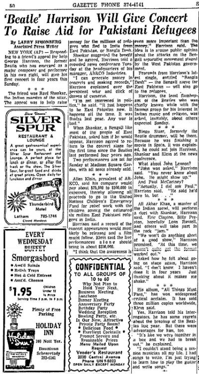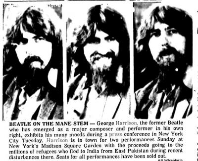 ২৮ এপ্রিল ক্লেইনের এবিসিকেও অফিসে এক সংবাদ সম্মেলনে কনসার্ট সম্পর্কে ঘোষণা দেন হ্যারিসন। অবশ্য তার আগেই, জুলাইয়ের শুরুতেই একটি ছোটো বিজ্ঞাপন ছাপা হয় নিউইয়র্ক টাইমসের পেছন পাতায়। ‘হ্যারিসন অ্যান্ড ফ্রেন্ডস’ দুটো কনসার্ট আয়োজন করতে যাচ্ছে বাংলাদেশের জন্য। বিটলদের সম্ভাব্য রিইউনিয়নের আঁচ পেয়েই হোক, তারকাদের নাম দেখেই হোক, কিংবা বহুদিন পর কনসার্ট হচ্ছে এই খুশীতেই হোক- ছয় ঘণ্টার মধ্যেই দুটো কনসার্টের ৪০ হাজার টিকেট শেষ। এমনিতে সাংবাদিকরা ফ্রি টিকেট পেয়ে থাকেন, তবে তারাও এই উদ্যোগের নেপথ্য কারণ জেনে ১২ হাজার ডলার অনুদান দিলেন আয়োজকদের। যদিও সবাই যে ব্যাপারটিতে হ্যারিসনের ভালো মানুষী কিংবা মহৎ কিছুর খোঁজ পেয়েছেন এমন নয়। ইয়োকো-লেননের বাদানুবাদে যেমনটি উঠে এসেছে, তেমন ভাবনা কিন্তু অনেকেই ভেবেছেন। এনিয়ে পরে এক সাক্ষাতকারে হ্যারিসন আক্ষেপ নিয়েই বলেছেন : "The Concert for Bangladesh was just a moral stance. These kinds of things have grown over the years, but what we did showed that musicians and people are more humane than politicians. Today people accept the commitment rock and roll musicians have when they perform for a charity. When I did it, they said things like, 'He’s only doing this to be nice.'"…