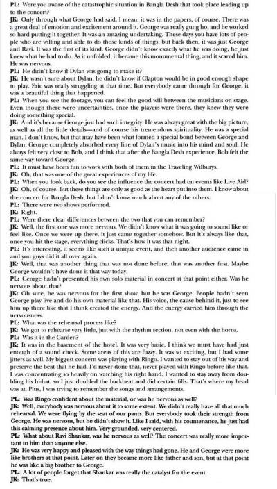এনিয়ে ইয়োকো ওনোর ভাষ্যটা অন্যরকম : Then a phone call came and John picked it up. He was saying "Yeah....yeah.....yeah," I saw that he was getting very upset. He hung up the phone without saying a word. ―What was that?" "Oh, that was George." A long pause.‖ He‘s saying. 'Join the Bangladesh concert,' and all that. Dylan is coming. too. I'm not going." "Why? I think we should go. It's a charity. It's for a good cause." I said. ―We‘re not doing it." "Why?" "Because it's George's little thing. We‘ll do our own. you and me." "I think we should