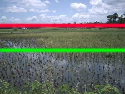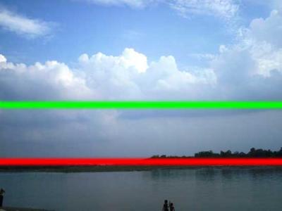 ৪. প্রাকৃতিক দৃশ্যের (Landscape)ছবি তুলবার সময় নিচের নিয়ম গুলো ফলো করত হবে। যেমন ধরুন আপনি নিচের ছবিটি তুলছেন (নদী ও আকাশ)। এক্ষেত্রে ভূমি ও আকাশের যে সংযোগস্থল (ছবিতে লাল দাগ) সব সময় সবুজ দাগের নিচে অথবা উপর থাকে। অর্থাৎ সংযোগস্থল যেন ছবির মধ্যাংশে না থাকে। একই ব্যাপার কৃষি ক্ষেতের ক্ষেত্রেও খাটে।