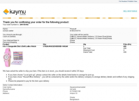 kaymu.com.bd আমার জিনিস delivery না দিয়েই feedback চাচ্ছে. কি করা যায় বলেনতো? গত ০৪-০২-২০১৫ তারিখে আমার মেয়ের জন্যে একটি 6 in 1 Changeable Dial & Belt Ladies Watch এর order দেওয়া হয় kaymu.com.bd এ, যার order # 200153182। এবং email এর মাধ্যমে ৪ তারিখে order confirmation এবং ৫ তারিখে delivery confirmation দেওয়া হয় উনাদের তরফ থেকে। এর মধ্যে কয়েকবার ফোন এর মাধ্যমে উনাদেরকে জানানো হয়, আমি অদ্যাবধি আমার জিনিস পাইনি। উনারা আমার জিনিস Delivery না দিয়ে আজ feedback চাচ্ছে। আমি নিয়িমত online এ চালডাল থেকে বাজার করি কোন সমস্যা ছাড়াই এবং মাঝেমাঝে রকমারী থেকে বই ক্রয় করি একই রকম কোন সমস্যা ছাড়াই। kaymu.com.bd এর এরকম লেনদেন মানুষকে বিমূখ করে দেবে বর্তমানে অগ্রসর এই online shopping concept থেকে।
