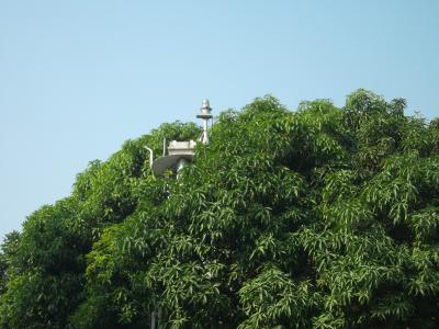 আম গাছে প্রায় হারিয়ে যাওয়া সোলার পাওয়ার্ড সিগনাল বাতি।