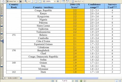 অবশেষে বাংলাদেশকে নামানো হইল সবচেয়ে দুর্নীতিগ্রস্ত দেশের স্থান থেকে। পাঁচ বছর দুর্নীতির চ্যাম্পিয়ন থকিবার পর অন্য দেশগুলোকেও কিছু সুযোগ দিল এবার। ট্র্যানসপারেনসী ইন্টারন্যাশনাল তাহাদের [link|http://tinyurl.com/yxspwq|2006 Gi wi