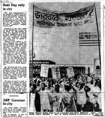 "বাইতুল মোকাররমে অনুষ্ঠিত পাকিস্তানের ইসলামী ছাত্র সংস্থার বদর দিবসে রেলীতে পাকিস্তানের একাত্বতা ও সার্বভৌমত্ব রক্ষার দাবী জানানো হয়। উক্ত অনুষ্ঠানের বক্তারা ঐতিহাসিক বদর যুদ্ধে অনুপ্রানিত হয়ে ইসলামের জন্যে যুদ্ধ করার জন্যে আহ্বান জানানো হয় এবং ভারতের ষড়যন্ত্রকে রুখার আহ্বান জানানো হয়।