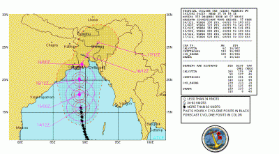 গুয়ামে অবস্থিত আমেরিকার জয়েন্ট টাইফুন ওয়ার্ণিং সেন্টারের বর্তমান পূর্বাভাস অনুযায়ী (প্রথম চিত্র) এটি এখন বাংলাদেশ সময় ১৫ নভেম্বর বৃহস্পতিবার সন্ধ্যা ৬ টা থেকে ১৬ নভেম্বর শুক্রবার ভোর ৬ টার মধ্যবর্তী সময়ে বাংলাদেশ তথা খুলনা উপকূল অতিক্রম করবে। আগের পূর্বাভাসের ঘূর্ণিঝড়ের গতিপথ বাংলাদেশ-ভারত সীমান্তের অবস্থান থেকে কিছুটা পূর্বদিকে সরে গিয়ে বর্তমান পূর্বাভাসে পুরোপুরি বাংলাদেশ উপকূল দেখানো হচ্ছে।