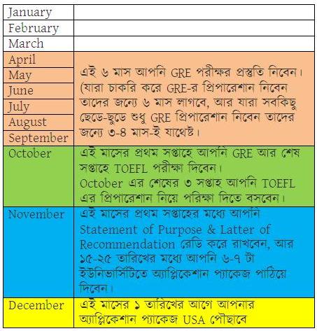 নিচে একটা টাইম লাইনের চার্ট দিয়ে দিচ্ছি। যদি আপনি ২০১৩ সালে ফল সেমিস্টার ধরতে চান, তাহলে আপনাকে ২০১২ সালের শুরু থেকে-ই GRE প্রিপারেশান নেয়া আরম্ভ করতে হবে।