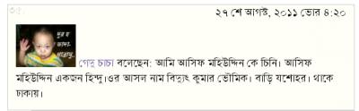 প্রিয় ব্লগার, কোন সৎ ও বিবেকবান মানুষ এমন আসিফ মুহিউদ্দীন (আসল পরিচয় বিদ্যুৎ কুমার ভৌমিক) হতে পারেনা। আপনারা সবাই এদেশকে বালবাসেন। ভালবাসেন এদেশের মাটিকে মানুষকে।তাই আপনারাই অথবা আপনাদের পূর্বসুরীরাই একদিন এদেশকে এদেশের মাটিকে এদেশের মানুষকে সকল হীন ষড়যন্ত্রের হাত থেকে মুক্ত করেছিলেন। আবারো প্রয়োজন হলে অবশ্ব্যই করবেন ইনশাআল্লাহ।