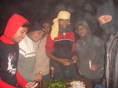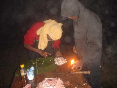 বি, ডি, আর দের সাথে কিছু সময় কাটিয়ে গেলাম রেমাক্রি বাজারে, রাতের খাবার খেলাম (এটা আসলে ছিল রাতের খাবারের আগে একটা ওয়ার্ম আপ) আর কিনে নিয়ে আসলাম ছাগলের সমান সাইজের (একটু কি বেশি বলে ফেলছি??) একটা মোরগ, চাল, ডাল, তেল, মশলা আর লাকড়ি; হাড়ি পাতিল ধার করলাম বাজার থেকে। ইট দিয়ে চুলা বানিয়ে শুর হল রান্নার আয়োজন। টিম লীডার ছিল পাচক শুকান্ত আর তার সহকারী জয়নুল ভাই ও ফুড ডিপার্টমেন্ট এর ২ মন্ত্রী এহসান ভাই, শাকিল ভাই। (টপ সিক্রেটঃ রান্নার ছবিতে আমরা বাকি যারা ছিলাম তারা শুধু ছবি তোলার জন্য পোজ দিসি)।