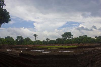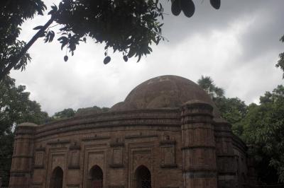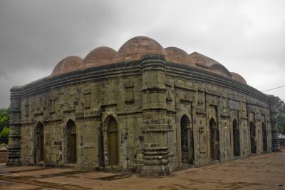 আমের বাজার মাত্র জমতে শুরু করেছে, এখনি বাজারে না গিয়ে আমরা একটা টেম্পুতে উঠে সোনামসজিদের দিকে রওয়ানা দিলাম। মাত্র ৫ মিনিট আগের সকালের সোনা রোদ মুখ লুকালো মেঘের আড়ালে, সেই সাথে ঝুম বৃষ্টি। মসৃণ রাস্তা দিয়ে ঝড়ো বেগে এগিয়ে চলা টেম্পুতে সবার প্রচেষ্টা রুবেলের আড়ালে থেকে যদি একটু বৃষ্টির ছাট থেকে বাঁচা যায়। টেম্পুর ছাদে বৃষ্টির রিমঝিম শব্দ, ঝড়ো বাতাস, রাস্তার দুপাশের আম গাছ গুলোর মাটিতে কুর্নিশ করার আকুতি, পাকা আমগুলোর গাছ থেকে ঝড়ে না পড়ার প্রানান্ত চেষ্টা আর বৃষ্টি-র ভালবাসাকে অবহেলা করে আমাদের তার কাছ থেকে দুরে থাকার প্রচেষ্টা করতে করতেই একসময় এসে পড়লাম সোনা মসজিদের প্রাঙ্গনে। টেম্পু থেকে ছিটকে বেড়িয়ে আশ্রয় নিলাম এক যাত্রী ছাউনিতে। ব্যাগ গুলোকে নিরাপদে রেখে এবার মনোযোগী হলাম বৃষ্টি-র সৌন্দর্য দেখতে।