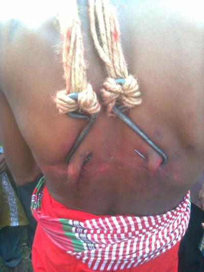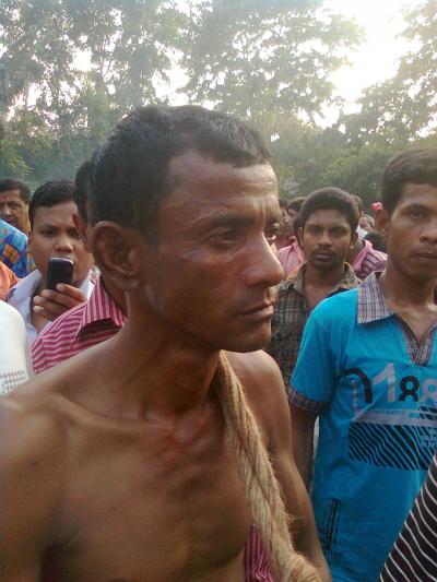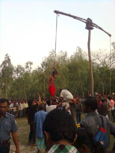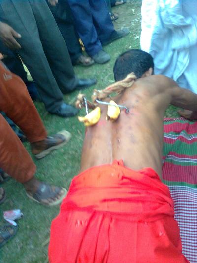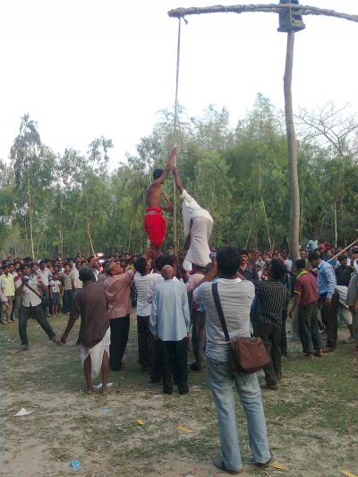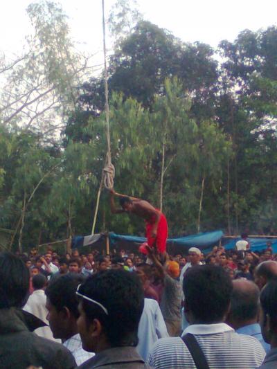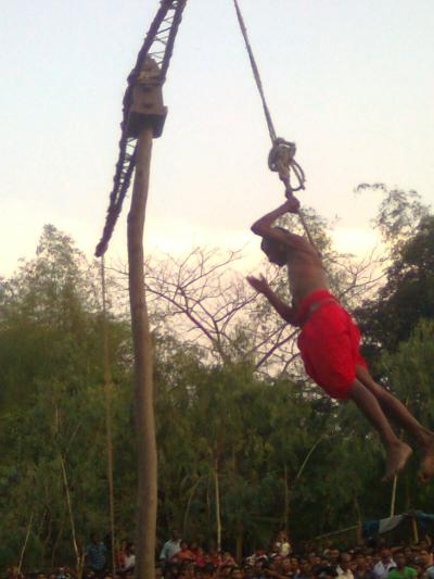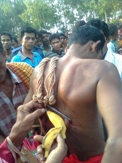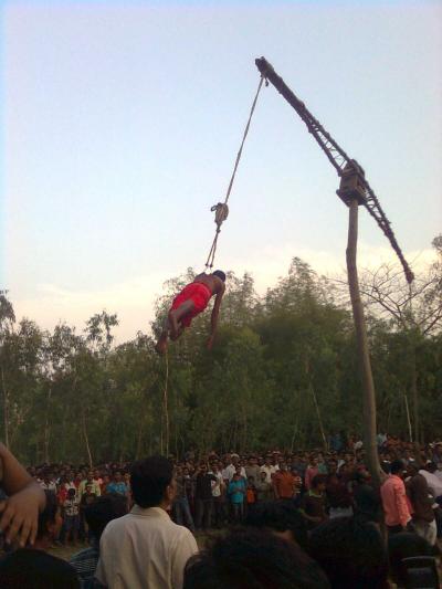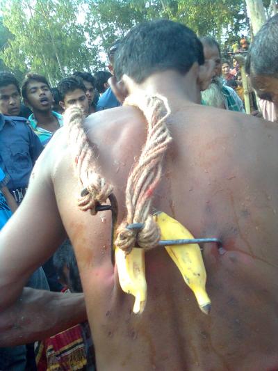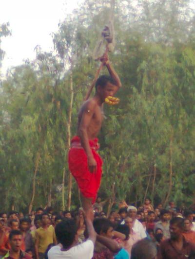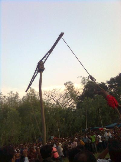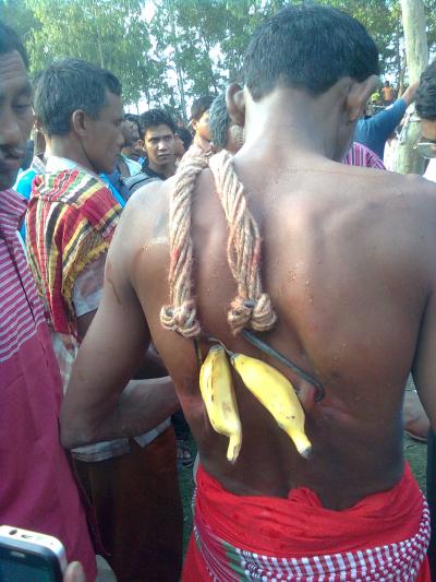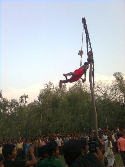 আজ পহেলা বৈশাখ গতকাল ছিলো চৈত্র মাসের শেষ দিন এই দিন ত্যাগ ও তিতীক্ষার প্রতীক স্বরূপ হিন্দুরা শাকপাতা ও তিতা করলা দিয়ে আহার করে । এবং পহেলা বৈশাখে মাছ মাংশ দিয়ে আহার করে, হয়তো বা সারা বৎসর যেনো সুখাদ্য গ্রহন করে সুখে শান্তিতে কাটিয়ে দিতে পারে তেমন প্রত্যাশা থেকেই হয়তো এই আচার আচরন রীতি নীতি গুলো পালন করা হয় । চৈত্র সংক্রান্তিতে দিনাজপুর গিয়েছিলাম । অনেক আগে থেকেই চড়ক পূজার নাম শুনেছিলাম কখনো দেখিনি । দিনাজপুরের মহারাজার রাজবাড়ীর কাছে বিরাট একটি দিঘী আছে নাম সুখ সাগর এখানেই চড়ক পূজা হয় । (দিনাজপুরে অনেকগুলি সাগর আছে যেমন মাতা সাগর, আনন্দ সাগর, জুলুম সাগর, রাম সাগর, জুলুম নাম হয়েছে কারন ওটা খননের সময় যে ব্যক্তিই ঐ জায়গা অতিক্রম করতো তাকেই খনন কাজে লাগিয়ে দেওয়া হত বিনা পারিশ্রমিকে) চড়ক পূজার উদ্দেশ্য সম্পর্কে কেউ তেমন কিছু বলতে না পারলেও কথাবার্তা থেকে যেটুকু বুঝতে পারলাম তাহল সারা বৎসরের অপরাধ ও অন্যায় থেকে মুক্তির আশায় মানুষের প্রতিনিধি হিসাবে দেবতার কাছে দুঃখ ও যন্ত্রনা ভোগ করে পাপের ক্ষমা চাওয়া । চড়ক পূজা নাম থেকেই আচ করা যায় এটা চড়কী পূজা মানে মানুষকে শিক দিয়ে বানানো বড়শিতে গেথে শূন্যে উঠিয়ে ঘোরানো হয় । মানুষটির পিঠে বড়শি গাথার পূর্বে কিছু প্রক্রিয়া অনুসরন করা হয় ঐ সময় আমি উপস্থিত থাকতে পারিনি । তবে শুনেছি পিঠে ঘী মর্দন করা হয় সিদুঁর মাখানো হয় তারপর পিঠে দুটি বড়শি গাথা হয় । চড়কীর এক পার্শ্বে ভারসাম্য বজায় রাখার জন্য আরেক জনকে বেধে দেওয়া হয় । ছবি গুলি আপনাদের জন্য ।