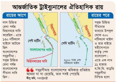 1. উপকূল থেকে বিশেষ অর্থনৈতিক জোন এবং মহীসোপানসহ মোট ৪৬০ মাইল পর্যন্ত আমাদের অধিকার প্রতিষ্ঠিত হয়েছে। ২০০ মাইল পর্যন্ত আমাদের বিশেষ অর্থনৈতিক অঞ্চল। এ জায়গাটি আমরা আমাদের ইচ্ছামতো ব্যবহার করতে পারব। অবশিষ্ট ২৬০ মাইল ব্যবহারের জন্য আন্তর্জাতিক বিধিবিধান রয়েছে। এই ২৬০ মাইল মহীসোপান আমরা একচেটিয়াভাবে ব্যবহার করতে পারব না। ধারা ৮২-তে বলা আছে, মহীসোপান ব্যবহার করতে হলে একটি অংশ দিতে হবে। এখান থেকে যে সম্পদ আহরিত হবে, আন্তর্জাতিক কর্তৃপক্ষকে পাঁচ বছর করে ১২ বছর যাবৎ কিছু কিছু দিতে হবে। ১২ বছর পর ৭ শতাংশ হারে নিয়মিতভাবে দিতে হবে। আমি মনে করি, এই রায়ের ফলে একটি নতুন দিগন্ত উন্মোচিত হয়েছে। এই রায়ের পর বাংলাদেশ, ভারত, মিয়ানমার কোনো দেশই একচেটিয়াভাবে বঙ্গোপসাগরের কোনো অংশ দাবি করতে পারবে না। নেদারল্যান্ডসের দি হেগে আন্তর্জাতিক সালিসি আদালতে এ বিষয়টি উঠবে।