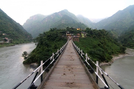 হঠাৎ রাস্তার ডানপাশে দারুণ একটা ঝুলন্ত ব্রিজের দেখা মিলে গেল। এটাই সম্ভবত আজকের দেখা সবচেয়ে সুন্দর জায়গা। দুইপাশের পাহাড়কে এক করেছে ব্রিজটা।ব্রিজের দুপাশে নদী দুদিকে বেঁকে গিয়ে হারিয়ে গেছে পাহাড়ের আড়ালে। অনেক দূরে দেখা যাচ্ছে বেশ উঁচু একটা ঝর্না। ব্রিজের পাশের দোকানে চা-বিরতি দিয়ে আবার যাত্রা শুরু হল।