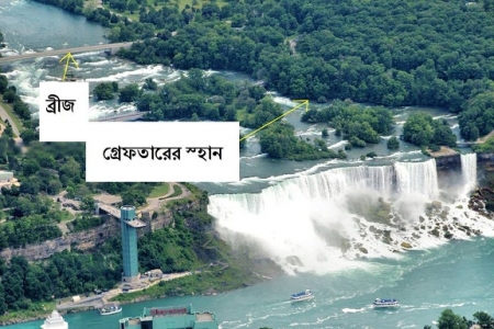 পার্কের এন্ট্রিতে পার হলে একটা জায়গা থেকে দেখলাম ছুোট লঞ্চ-এ করে নীল জামা গায়ে অনেক লোক একদম জলপ্রপাতের নীচে যাচ্ছে । সবার গায়েই নীল ! আবার আরেকটা লঞ্চ দেখলাম সবার গায়েই হলুদ । আসলে এগুলো সব রেইন কোট। টিকেট কেটে এসব লঞ্চে করে ফলস এর নীচে নিয়ে যায় । বিশাল পানির পতনে পুরো এলাকাটা কুয়াশায় ঢেকে যায় । বিন্দু বিন্দু জলে গায়ের জামা কাপড় সব ভিজে যায় । মাথা পিছু বিশ ডলার ভাড়া । রেইনকোট ফ্রী । আসলে ঠিক রেইনকোট না - একদম পাতলা প্লাষ্টিকের আবরণ ওয়ান টাইম ইউজ । আবার কানাডা সাইড থেকেও লঞ্চ ছাড়ে । দু দেশের লঞ্চের যাত্রীদের রেইনকোটের রং আলাদা । আমেরিকাম হলে নীল আর কানাডা হলুদ।আমার কাছে বিশ ডলার অনেক টাকা - কিন্তু এসুযোগ মিস করা যায় না । প্রথমে ভেবেছিলাম লঞ্চে উঠে পাণিতে লাফ দিব । এরপর স্রোতের সাথে ভেসে ভেসে একপাশ উঠে যাব । কিন্তু শেষ পর্যন্ত সাহষ হল না । পানিতে অসংখ ছোট ছোট বুদবুদ ছিল । সম্ভবত এসব জায়গায় লাফ দিলে আর বাচার আশা ছিল না । বুদবুদের কারণে পানি আপনার শরীরে স্বাভাবিক চাপ প্রয়োগ করবে না । তাই সেখানে ভেসে থাকা সম্ভব হবে বলে মনে হয় না ।