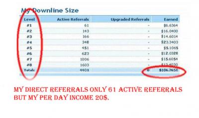 আপনি যদি regular কাজ করেন আর আপনার referral বাড়ান তবে আপনি ইনশাল্লা প্রতিদিন ১- থেকে ৪০ ডলার আয় করতে পারবেন নিচে আমার downline and per day income এর পিকচার দেখেন............