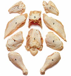 যা যা টুকরো হয়েছে তা হল a. পা বা মুরগীর রান, b. থাই, c. মুরগীর পাখনা, d. নীচের বুকের পাজরের সামনের অংশ. e. লেজ এবং নীচের বুকের পাজরের পিছনের অংশ f. মাংশল বুক