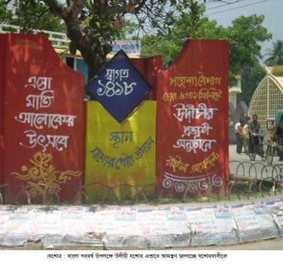 নববর্ষের রঙে রঙ্নি হয়ে উঠবে যশোর। বর্তমানে নামকরা সাংস্কৃতিক সংগঠনগুলো সে কাজেই ব্যস্ত। এরমধ্যে একটি অলিখিত প্রতিযোগিতাও চলছে তাদের মধ্যে। সে প্রতিযোগিতা কে কত ভাল করতে পারে তার। এ জন্য সংগঠনগুলোর কর্মীরা রাত-দিন কাজ করছে। শহরে বের হলেই তার প্রমান পয়া যায়। মোড়ে মোড়ে নববর্ষ পালনের আহবান সম্বলিত লেখনি ও ফেস্টুন। কোথাও কোথাও দেয়ালে ফুটিয়ে তোলা হয়েছে বাঙালি সংস্কৃতির প্রতিকৃতি। আর বিপণী বিতানগুলো সাজানো হয়েছে নববর্ষের বর্ণিল পোষাকে। সবকিছু মিলে যশোরে বিরাজ করছে উৎসবের আমেজ।