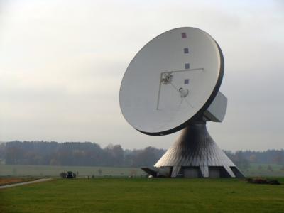 ৩২ মিটার ডায়ামিটার রিফ্লেক্টর এর এন্টেনা (মাটি থেকে ১৫তলা বিল্ডিং এর চেয়েও বড়),[ ছবির বাম পাসে রাস্তার উপর একটা গাড়ি আছে, দেখতে পান?]: