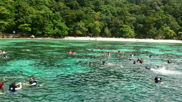 আমরা ঝটপট সবাই কাপড় বদলিয়ে স্নোরকল ও লাইফজ্যাকেট পড়ে রেডি, আমি ইচ্ছা করে লাইফজ্যাকেট পড়িনি, কারন লাইফ জ্যাকেট পড়ে ডুব দেয়া যাবে না। একটু পরে দলের সবাইকে স্নোরকল কিভাবে ব্যাবহার করতে হবে এর উপরে একটা ফ্রি ক্লাস নিয়ে নেমে পড়লাম পানিতে। পানিতে নেমে মাথা খারাপ অবস্থা, নীচে এক বর্ণিল জগত, যেমন প্রবালের রং তেমন রং বেরং এর হজারে হাজারে মাছ।