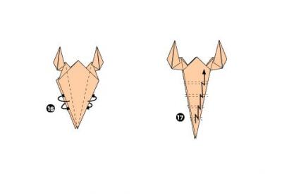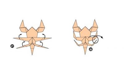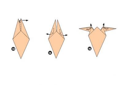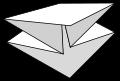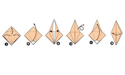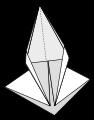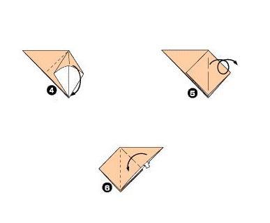 ছবি 4 -এ কাগজটির ভাঁজ খুলে ২ নং ছবির অবস্থায় নিয়ে যান এবং 4 নং চিত্রানুসারে ভাঁজ দিন। ৫ নং ছবিতে যে প্যাঁচ যুক্ত তীর চিহ্ন রয়েছে, তার অর্থ হল, “ তলটি কে সম্পূর্ণ উল্টিয়ে নিন”। সুতরাং 5 নং এ যে অবস্থা দেখানো হয়েছে সেটাকে পুরোপুরি উল্টিয়ে নিন, এবং 4 নং এর মত একই ভাঁজ দিন। তার ফলে ৬ নং এ যে ছবি দেখছেন তার ত্রিমাত্রিক চিত্র হবে নিচের মত।