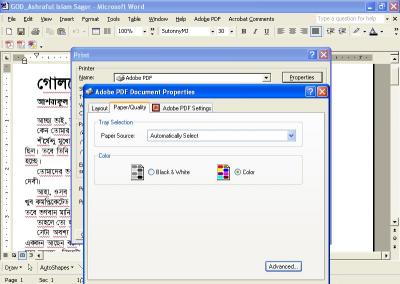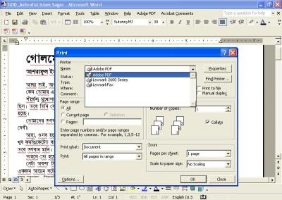 ওকে, উপায় হলো, আপনি প্রিন্ট অর্ডার দিবেন। তার আগে দেখুন, আমি এই লেখাকে বই আকারে সাজাতে চাই। প্রিন্ট অর্ডার দিলে একটা ডায়ালগ বক্স আসবে। এখানে একদম উপরে পাবেন, প্রিন্টার নেম। এখানে ক্লিক করে প্রিন্টার হিসেবে "এডোব পিডিএফ" সিলেক্ট করুন।