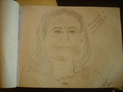 হোটেলের ফ্রন্ট ডেস্কে বসা একজন ভুটানিজ তরুনেরর আঁকা বাংলাদেশের প্রাইম মিনিস্টারের মুখের ছবি।