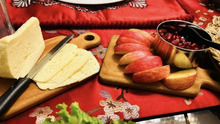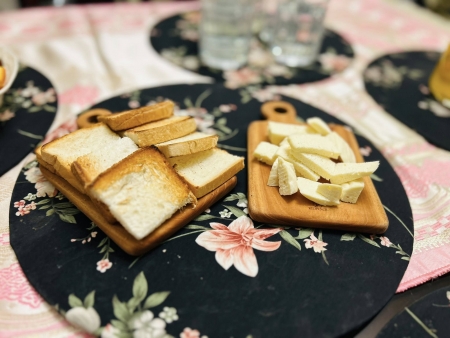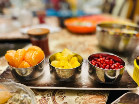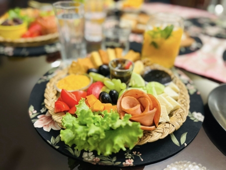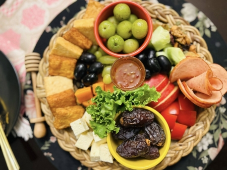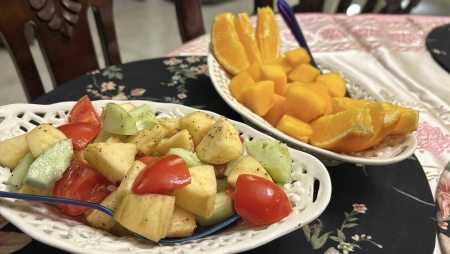 আছে টফু, ফল, সালাদ, সস, সালামী