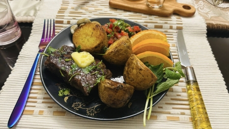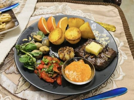 সাথে আলু, মাশরুম, সালাদ, রসুন, মাল্টা, সস