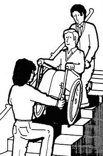নীচের পদ্ধতিতে মাত্র দু'জন মানুষের সাহায্যে কিভাবে হুইলচেয়ারে বসে আছেন, এমন একজনকে সিঁড়ি দিয়ে উপরে তোলা ও নামানো যায়, তা বলা হয়েছে.।