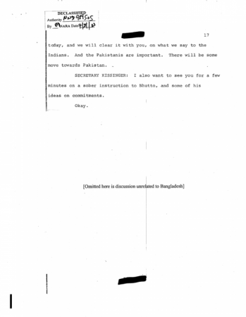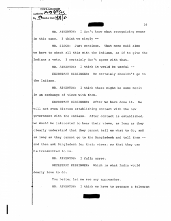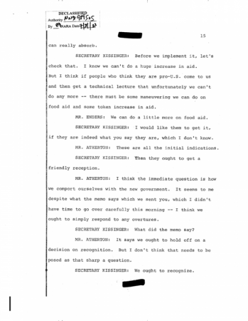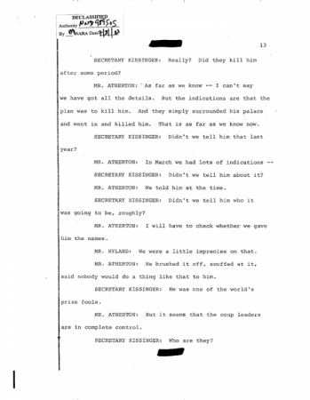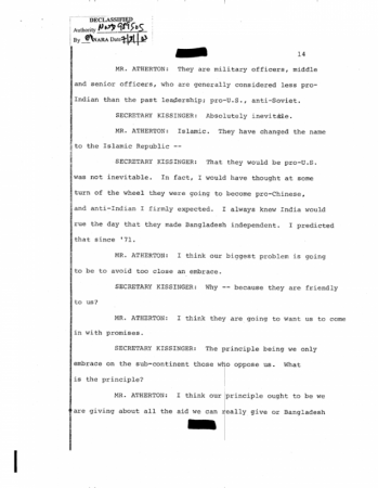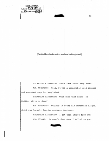 অন্যদিকে আগস্ট ১৫ , ১৯৭৫ এর দিনকার বিখ্যাত সিআইএ ডকুমেন্ট যেটাতে হেনরী কিসিন্জ্ঞার , সিসকো এবং আর্থারটনের ইমিডিয়েট পোস্টমুজিব মার্ডার কথোপকথন পাওয়া যায় সেটা দেখুন নীচে :