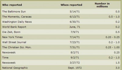 সুতরাং একটা যুদ্ধে নিহত এবং নির্যাতিতাদের সংখ্যা নির্নয়ের ক্ষেত্রে আদমশুমারীর মতো শান্তিকালীন প্রক্রিয়ার প্রয়োগের চিন্তা করা একটা কল্পনা মাত্র। তার পরও একটা প্রাক্কলিত সংখ্যাকে বাস্তবতার নিরিখে গ্রহন করার প্রবনতা লক্ষ্য করা যায়। বাংলাদেশের ক্ষেত্রেও এমনটাই হয়েছে। নীচে একটা তালিকাটায় দেখা যায় মুক্তিযুদ্ধ চলাকালীন বিভিন্ন মিডিয়াতে যে হিসাব দিয়েছিল - তার থেকেই বাংলাদেশের তৎকালীন নেতারা সর্বোচ্চ সংখ্যাটা গ্রহন করেছেন।