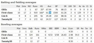 প্রথম শ্রেণীর ১০ টি ম্যাচে তার রয়েছে ৩টি সেঞ্চুরী এবং ৬টি হাফ সেঞ্চুরী। তার সর্বোচ্চ রান অপরাজিত ১৬৬। ব্যাটিং গড় ৬১.২৬।