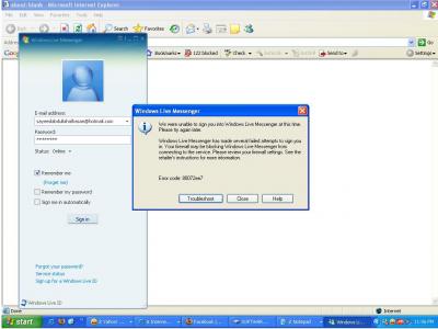 ভাই সকল । সব্বাই কে ঈদের উষ্ঞ শুভেচ্ছা । আমি একটি বিরাট সমস্যায় পড়েছি । আমার এমএসএন এর মেসেন্জারে কোনমতেই সাইন ইন হচ্ছেনা । অনেক ভাবেই চেষ্টা করা হয়েছে । কিছুতেই কিছু হয়না । শুধু এই ছবিটি আসে।