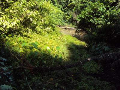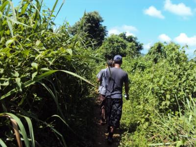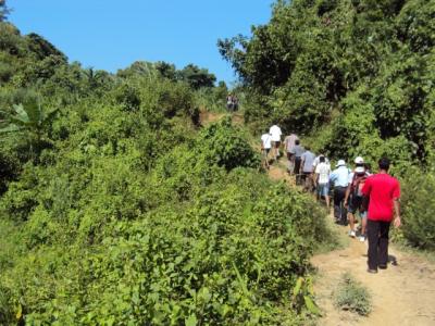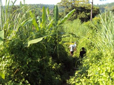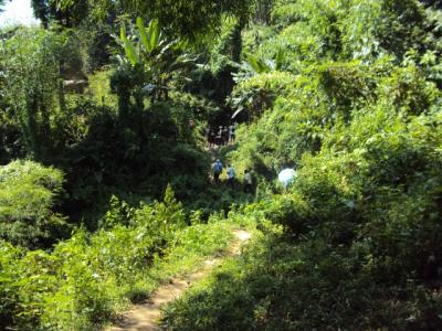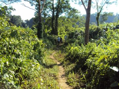 প্রথম ছড়াটি পার হয়ে। পাহাড়ের উঁচু পথ ধরে হাঁটছে সবাই। দুই ধারে ঝোপঝাড় দেখা যাচ্ছে।