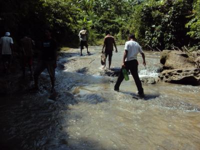 সামনে দেখা যায় কোমর সমান পানি। পাহাড়ী কলার ছড়া দেখা যাচ্ছে একজনের কাঁধে। বেশ রিস্কি জায়গা মনে হচ্ছে।