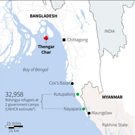 বাংলাদেশ থেকে প্রত্যাবাসনের আগে নিবন্ধিত ও অনিবন্ধিত রোহিঙ্গাদের পর্যায়ক্রমে নোয়াখালি জেলার হাতিয়া উপজেলার ঠ্যাঙ্গার চরে স্থানান্তর করা হবে, যা বছরের অর্ধেক সময় জলের তলায় থাকে।
