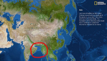 পানির অভাবে দেশের নদী-নালা শুকিয়ে যাচ্ছে, সেইসাথে বর্ষা মৌসুমে ডুবে যাচ্ছে সমগ্র দেশ। এই পরিস্থিতি অনেকটা নিত্য ব্যাপার হলেও আগামী ৫ হাজার বছর পরে বাংলাদেশ বলে কোনো ভূখন্ড থাকবে না বলে তথ্য প্রকাশ করেছে 'ন্যাশনাল জিওগ্রাফি'। তাদের প্রকাশিত এক বিশ্ব-মানচিত্রে বিভিন্ন দেশের বিভিন্ন শহরের সঙ্গে বাংলাদেশের মানচিত্র দেখা গেছে পানির নীচে।