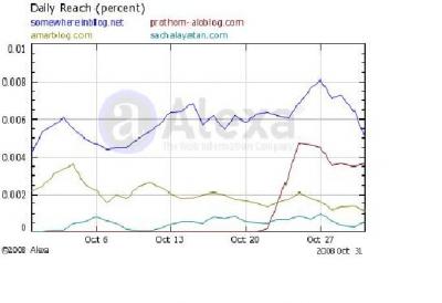 অ্যালেক্সা থেকে নেয়া বাংলা ব্লগগুলোর তুলনামূলক হিটের তালিকাটা দেখুন। হিটের দিক থেকে সামহয়ার এখনও সবার উপরে এবং প্রথম আলো ব্লগ কোনরকমে টিকে থাকলেওআমার ব্লগ ও সচলায়তনের অবস্থা তথৈবচ ।