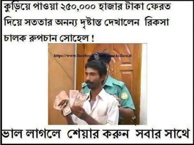 কুড়িয়ে পাওয়া ২৫০,০০০ হাজার টাকা ফেরত দিয়ে সততার অনন্য দৃষ্টান্ত দেখালেন রিকসা চালক রুপচান সোহেল ।