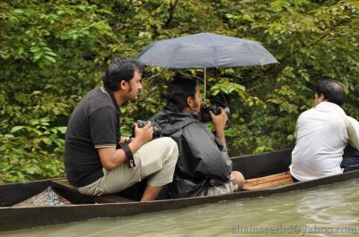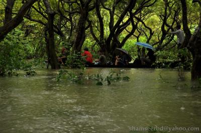 দুপাশে ঘন হিজলের বন, হিজল গাছগুলোর সাত আট ফিট পানির নিচে বাকি অংশ উপরে। ঝুপ করে গাছগাছালির ফাঁক গলে আমরা ঢুকে গেলাম ভেতরে, সেখানে দেখি আরো অনেক গুলো নৌকা, সেটা কোন সমস্যা না হলেও সমস্যা হচ্ছে তাতে বসা লোকজনের অযথা চিতকার । যাই হউক আমরা আমাদের মত করে তিনটি নৌকা নিয়ে ঘুরে বেড়ালাম ।হঠাত করে দেখি আমরা আগের জায়গায়, মেজাজটায় খারাপ হয়ে গেল মাঝির উপর, বেটা ফাজলামি করে একটু ঘুরিয়েই আমাদেরকে নিয়ে এসেছে। ঝাড়ি টারি দিয়ে আবার নৌকা ভাসানো হল, এত অল্প ঘোরায় আমরা সন্তুষ্ট নই। ধরা খেয়ে মাঝির ও মনে হয় রাগ চাপল, সাথে ঝুম বৃষ্টি।