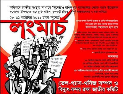 আজ ২৮ শে অক্টোবর "সুনেত্র" অভিমুখে লংমার্চ শুরু করেছে তেল-গ্যাস খনিজ সম্পদ ও বিদ্যুৎ-বন্দর রক্ষা জাতীয় কমিটি। সুনেত্র গ্যাস ক্ষেত্রের নানাদিক পর্যালোচনা করে অনেকের মতামত দেশের সম্পদ দেশীয় ব্যবস্থাপনাতেই উত্তোলন করা সম্ভব। এর জন্য অন্যায্য নির্ভরতার কোন প্রয়োজন নেই। তাই তাদের একটাই দাবী, নিজের সম্পদ বেনিয়াদের হাতে তুলে দেয়া হবে না। রুখে দিতে হবে মধ্যস্বত্বভোগী সব দালালদের।