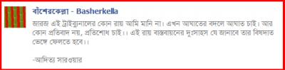 দিনের বেলা তো অনেকটা সময় ফেসবুকে ঢুকতে পারিনি। একটু আগে আরেকবার ট্রাই করতেই পেজ এসে গেল। লগ-ইন করেই হোমপেজে দেখি আমার এক সাবেক ক্লাসমেট (ভার্সিটির) 'বাঁশের কেল্লা'র কয়েকটা বার্তা শেয়ার করেছে। পুরাই গরম!