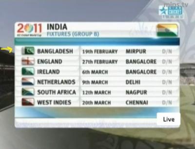 এই মূহুর্তে দাদাদের সহিত অস্ট্রেলিয়ার ওয়ার্মআপ ম্যাচ চলিতেছে। অসি বোলিংয়ের তোপে তেনাদের ধুতির কোচা খুলিয়া যায় যায় অবস্থা (চলতি স্কোরঃ ভারত ১৬৩/৮, ওভার ৩৭)। যাইহোক, খেলার ফলাফল লইয়া এই পোস্টের অবতারণা নয়। ইএসপিএন স্টার ক্রিকেট চ্যানেলে উহাদের খেলা সরাসরি সম্প্রচার করা হইতেছে। তা ইএসপিএন স্টার ক্রিকেট দাদাদের মালিকানায় পরিচালিত বিধায় তাঁহারা লাইভ ব্রডকাস্ট করিবেক, ইহাই স্বাভাবিক। হিংসুটে কুচুটে স্বভাবের বাঙ্গালি ইহাও হজম করিয়া লইতে রাজী আছি। কিন্তু তারপর...ও হরি! এ কী হেরিলাম!!! ধারাবিবরণকারী হঠাৎ একসময় বিশ্বকাপের ‘বি’ গ্রুপের ফিক্সচার উল্লেখ করিবার সময় টেলিভিশন পর্দায় নিম্নসদৃশ দৃশ্য ভাসিয়া উঠিলঃ