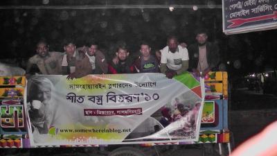 এসকল কম্বল, চাদর ও প্রায় ৩০ বস্তা বাছাইকৃত পুরাতন পোষাক নিয়ে আমরা ৬ জন গত ১৮/১২/২০১০ ইং তারিখে রাত ১০ টায় পিক আপ যোগে লালমনিরহাটের উদ্দেশ্যে রওনা দেই।
