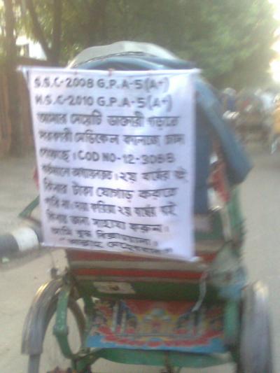 তাই এই বিশাল পৃথিবীর মাঝে ছড়িয়ে দিলাম তোমার কথা. তোমার বাবার কথা। তোমার বাবার রিকশার ছবিটা দিলাম। তোমার বাবা তাঁর ছবি তুলতে দেননি। কেন জানো? যে পিতা তার সন্তানের মেডিকেলের বই কিনে দিতে পারেন না, তার মুখ নাকি এতো ঘটা করে দেখাবার কিছু নেই!! তিনি শুধু তোমার জন্য সাহায্য চান আর কিছু না।