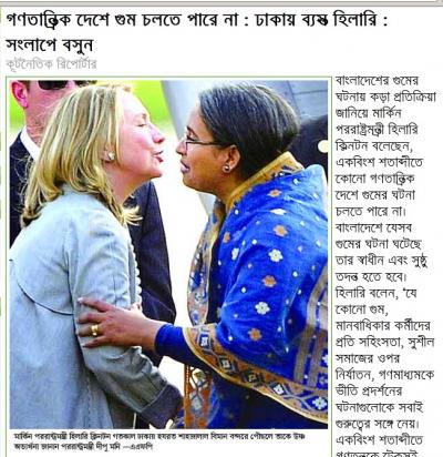 বিদেশী রীতি অনুযায়ী হয়তোবা দীপু মনি সম্বর্ধনা জানিয়েছিলেন হিলারিকে। তাই বলে কি এমন ছবি-ই প্রকাশ করতে হবে ? আর কোন ভালো ছবি তুলতে পারে নি আমার দেশের ফটোগ্রাফার ? যাচ্ছেতাই লাগছে দেখতে। আমার দেশের সংবাদে কমেন্ট করবার সুযোগ নেই। তাই ব্লগে প্রকাশ করলাম। সংবাদপত্র জাতির বিবেক। কিন্তু আমাদের বাংলাদেশের সংবাদপত্রগুলো মূলত হিংসা-বিদ্বেষ ও পরশ্রীকাতর প্রবল। আফসোস।