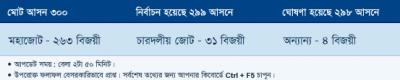 পোস্টের শিরোনাম দিবো ভেবেছিলাম "মহাজোটকে অভিনন্দন।" কিন্তু পরে দেখলাম ২৯৮ টি আসনের ভেতর মহাজোটের দখলে ২৬৩ টি আসন। তার ভেতর আওয়ামীলিগ একাই পেয়েছে ২৩০ টি আসন। সেখানে চারদলীয় জোট মাত্র ৩১ টি। এরকম বিশাল ব্যবধানে জেততে পারাটা, আসলেই এটা আওয়ামীলিগের ব্যাপক বিজয়।