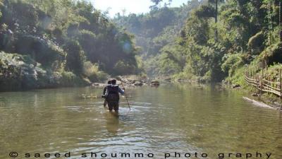 আমরা নদীতে নেমে গেলাম। পাহাড়ী নদী। কোন ঠিক ঠিকানা নাই। কোথাও হাটু পানি, পরক্ষনই গলা পানি। খুজে পেতে যেই জায়গা দিয়ে আমরা পার হলাম তাতে পেট আর বুকের মাঝা মাঝি পর্যন্ত ডুবলো। ব্যাকপেকের আদ্ধেকই পানির নিচে।