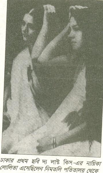 ঢাকার প্রথম পূর্নাঙ্গ নির্বাক চলচিত্র ছিল ‘দ্য লাষ্ট কিস’ এর নায়িকা ছিল লোলিতা তাকে বাদামতলীর নিষিদ্ধ পল্লী থেকে নিয়ে আসা হয়। তার আসল নাম ছিল বুড়ী। তখন তার বয়স ছিল মাত্র ১৪ বছর। ছবির কাজ শেষে বুড়ী আবার পুরানো পেশায় ফিরে যায় এর বেশি কিন্তু লোলিতার সন্মন্ধ্যে জানা যায় না। মঞ্চে তাদের অভিনয় করানোর জন্য অনেক পত্র পত্রিকায় জোর প্রতিবাদ জানানো হয়। তাদের সঙ্গে যে এক মঞ্চে উপবেশন করাই অসন্মানের। দ্যা লাষ্ট কিসের সহ নায়িকা চারুবালাকে আনা হয় কুমারটুলী পতিতালয় থেকে জিন্দাবাহার লেন থেকে আনা হয় দেববালাকে।