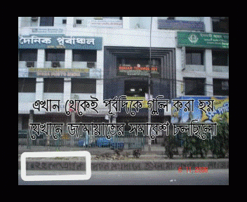 সেইখানে সরেজমিনে গিয়ে দেখা গেছে, যদি ছবিটা সোজা করে ধরা হয় তবে দেখা যায় যে, পিস্তলের ডিরেকশন ইঙ্গিত করে গুলি যাচ্ছে আওয়ামী শিবির থেকে জামায়াত শিবিরে।