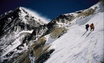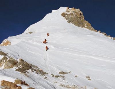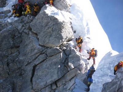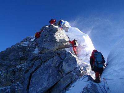 এই পাথরময় জায়গাটা হিলারী স্টেপ, চূড়োর ঠিক নীচে (উচ্চতা ৮,৭৬০ মিটার - ২৮,৭৪০ ফুট )। এখানে অনেক সময়ই ট্র্যাফিক জ্যাম লেগে যায়, সরু জায়গাটা বেয়ে ওঠার জন্য অপেক্ষা করতে হবে।